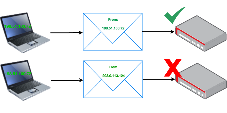 BCP 38 filters: The router rejects the packet coming from the laptop when its origin IP address does not match the assigned address