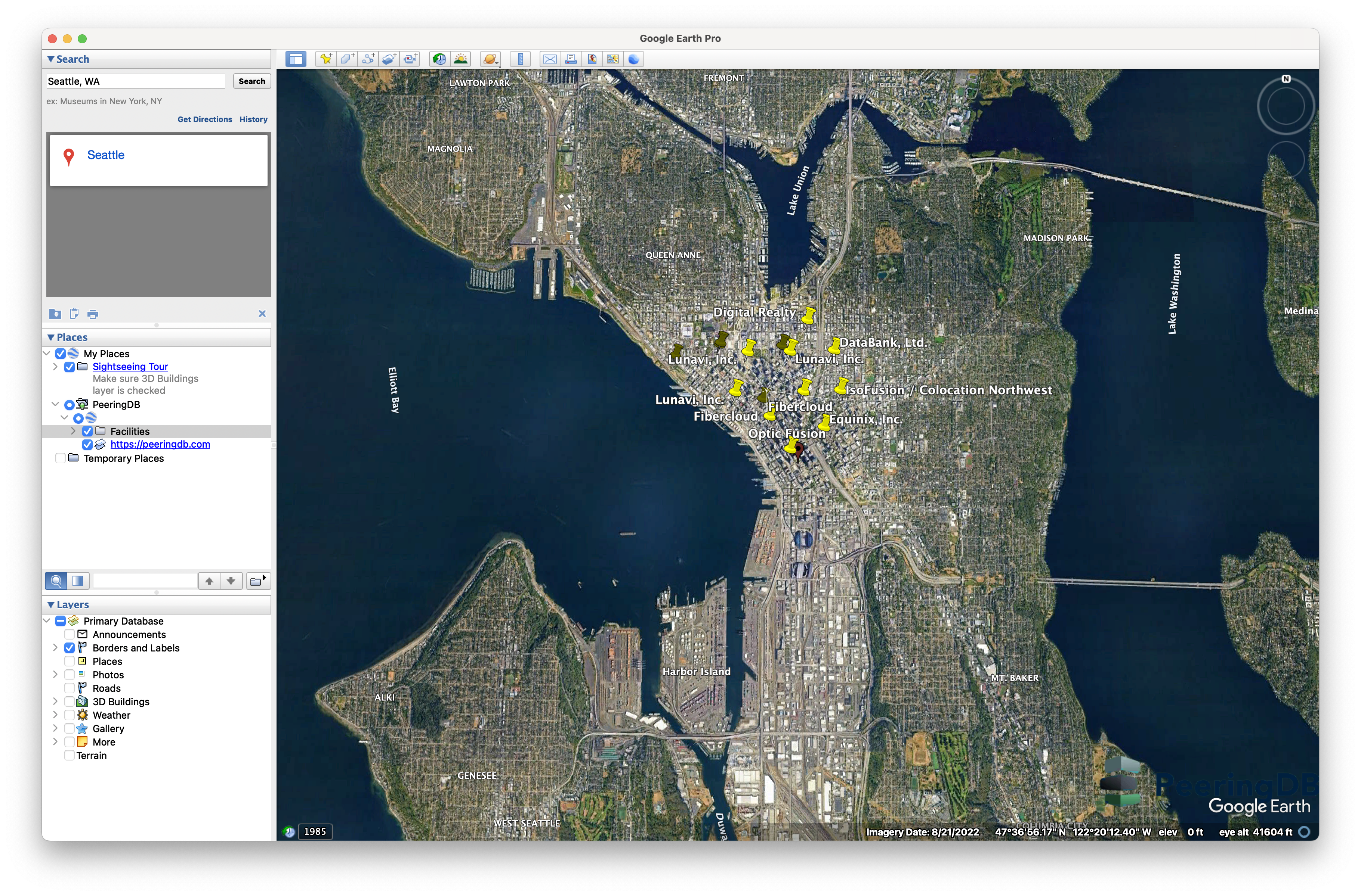 PeeringDB data for Seattle, WA shown in Google Earth Pro from its daily KMZ dataset.