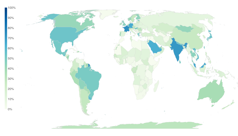 Global IPv6 traffic measured by Google: https://www.google.com/intl/en/ipv6/statistics.html#tab=ipv6-adoption