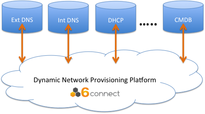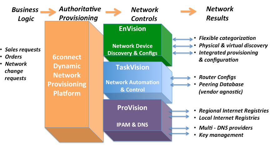ProVision, 6connect‘s unique Dynamic Network Provisioning (DNP) control platform, overcomes legacy provisioning’s ineffectiveness created by decoupling network control from network vendor hardware or software. This platform dynamically and holistically provisions all the network control factors needed to initiate and operate network and data center elements, including IP addresses, DNS zones, DNSSEC keys, DHCP pools, VLAN and other device level information. Available as either a highly scalable cloud or on-premise solution, ProVision automatically controls these factors across distributed and separate physical networks in order to reduce errors that can crash networks, cause compliance errors, and delay the creation of new services. DNP delivers significant value and benefits in network function virtualization(NFV), device configuration, and interoperability across heterogeneous network technologies.