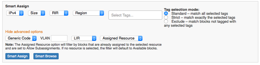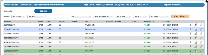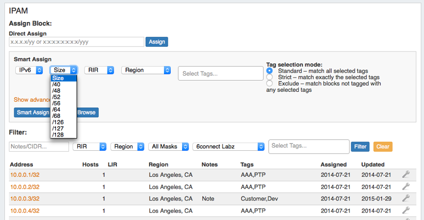 Below, Figure 9 provides a GUI perspective on the same Smart Assign feature. In this screen, you can see multiple assignments to a particular resource holder. These allocation requests can be of various sizes in addition to tag/region capabilities. Note that it is designed to work consistently whether completed via the API or GUI with all requests logged and tracked by user/source IP and the workflow is the same whether dealing with IPv4 or IPv6 resources.