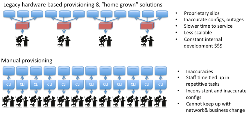 However, many Service providers still extensively rely on legacy, manual procedures or hardware intensive solutions to provision their networks, slowing down their responsiveness to customer needs, network demand changes, and leading to inaccurate provisioning that can create resource conflicts between network resources and even outages. The shortcomings of these approaches are summarized in Figure 3 below.