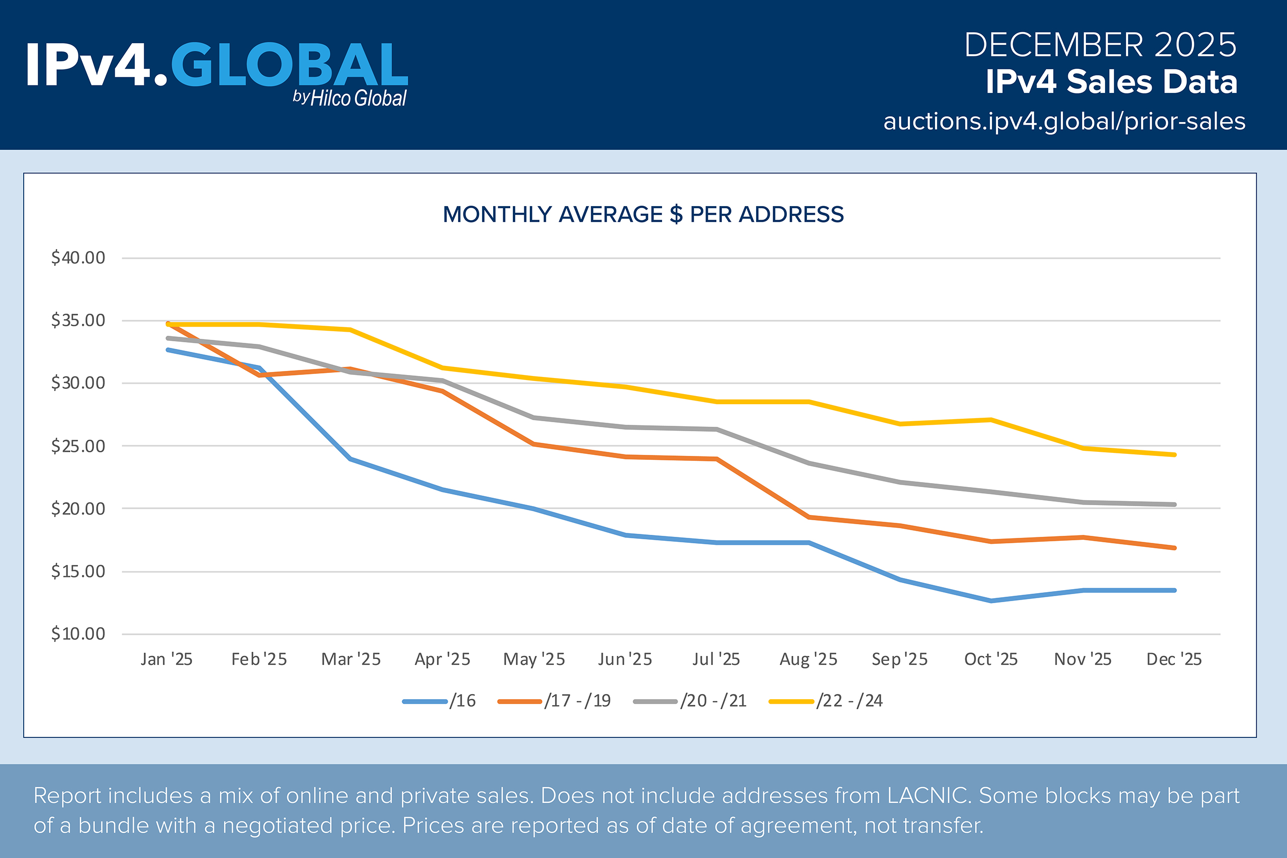 Throughout 2025, IPv4 block pricing continued its downward trend, with pricing of large blocks (/16+) hitting 10-year lows. While pricing declined, overall transaction volume and buyer demand stayed strong, and the pool of active buyers has increased significantly. As a result, we have seen an increase in transaction volume. These fundamentals point to a healthy, well-functioning market as we move into 2026.