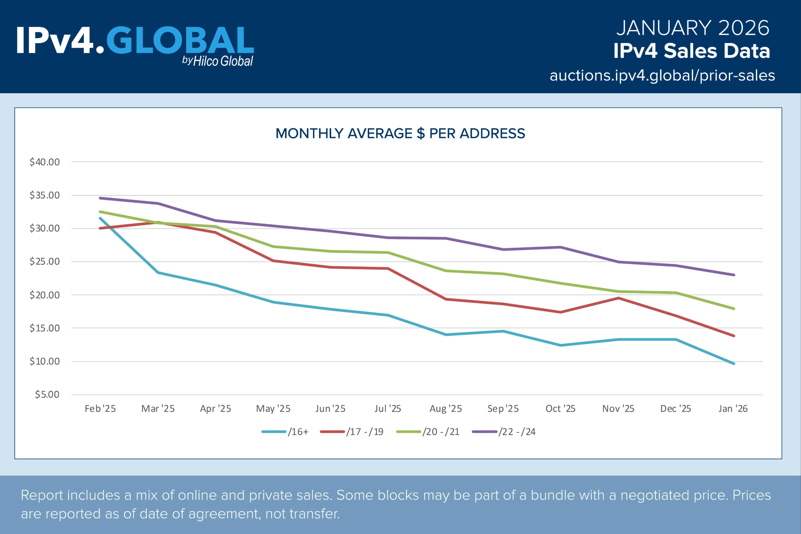 January 2026 opened with continued momentum in the IPv4 transfer market, with transaction volume reaching new highs and a notable influx of new buyers entering the space. Despite increased demand, average prices continued to trend downward, though lower /16+ pricing reflects larger package sales completed at discounted rates.
